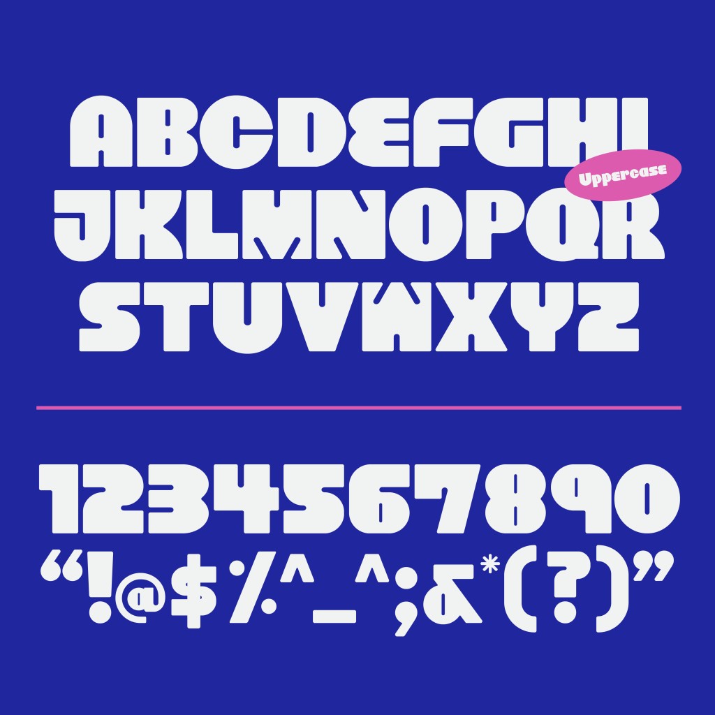 The purpose of font presentation is to showcase how the font can be used in specific contexts, not to flaunt how many words I can squeeze into a tiny square canvas. Since my font is very thick and takes up a lot of space, I mostly used very short keywords for all my font presentations, except for the second one, which showcases all my uppercase letters, numerals, and punctuation.