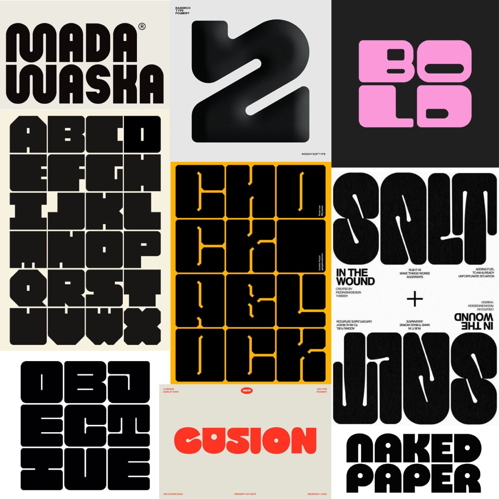 I wanted to design a bold, fat typeface that screams “Look at me!” but in a polite way (if you get what I mean). Before beginning the design process, I used my wordmark as a guideline to collect visual references of thick typefaces that could support my ideation and serve as inspiration.