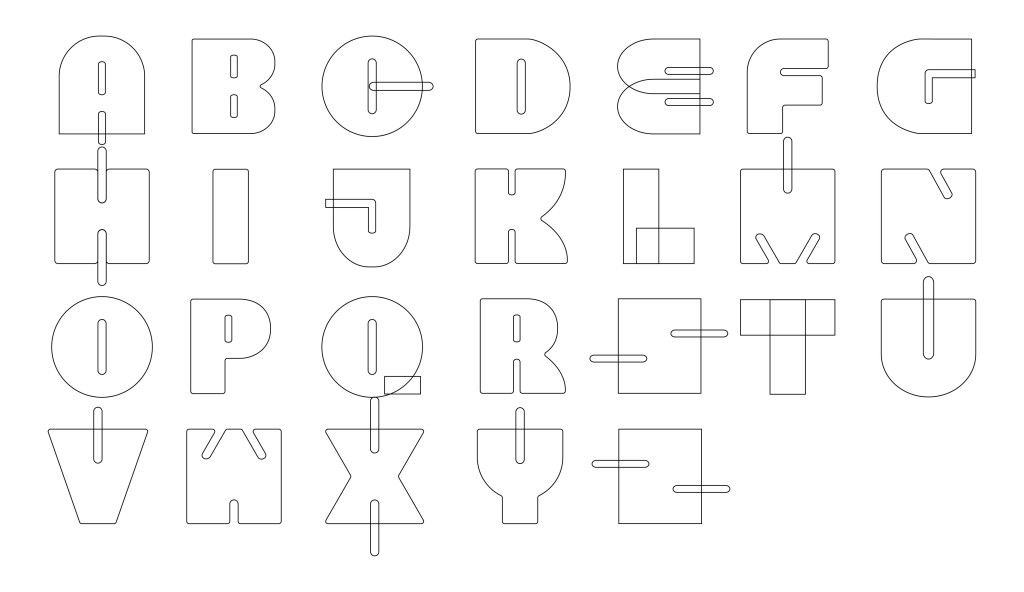 I worked with these three elements repeatedly, uniting them into compound shapes, rounding corners, or cutting them in half until I achieved the forms I envisioned. To maintain consistency, all letters share the same counter space shape, which I adjusted by either uniting or slanting at 210 degrees depending on the letter. Finally, I added a corner radius to the letters to give the font a more approachable and friendly character.