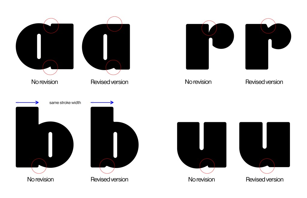 For my lowercase letters, I decided to design a simpler version—most of the letters are scaled down from the uppercase letters. During the feedback session, Mr. Vinod gave a design suggestion for the ink trap of letters a, b, d, p, and q. The width of the ink trap becomes slightly narrower, and for letter a, the stroke is merged together with the circle shape. I liked the suggestion and went along with it, revising letters n, r, and u as well to ensure consistency.
