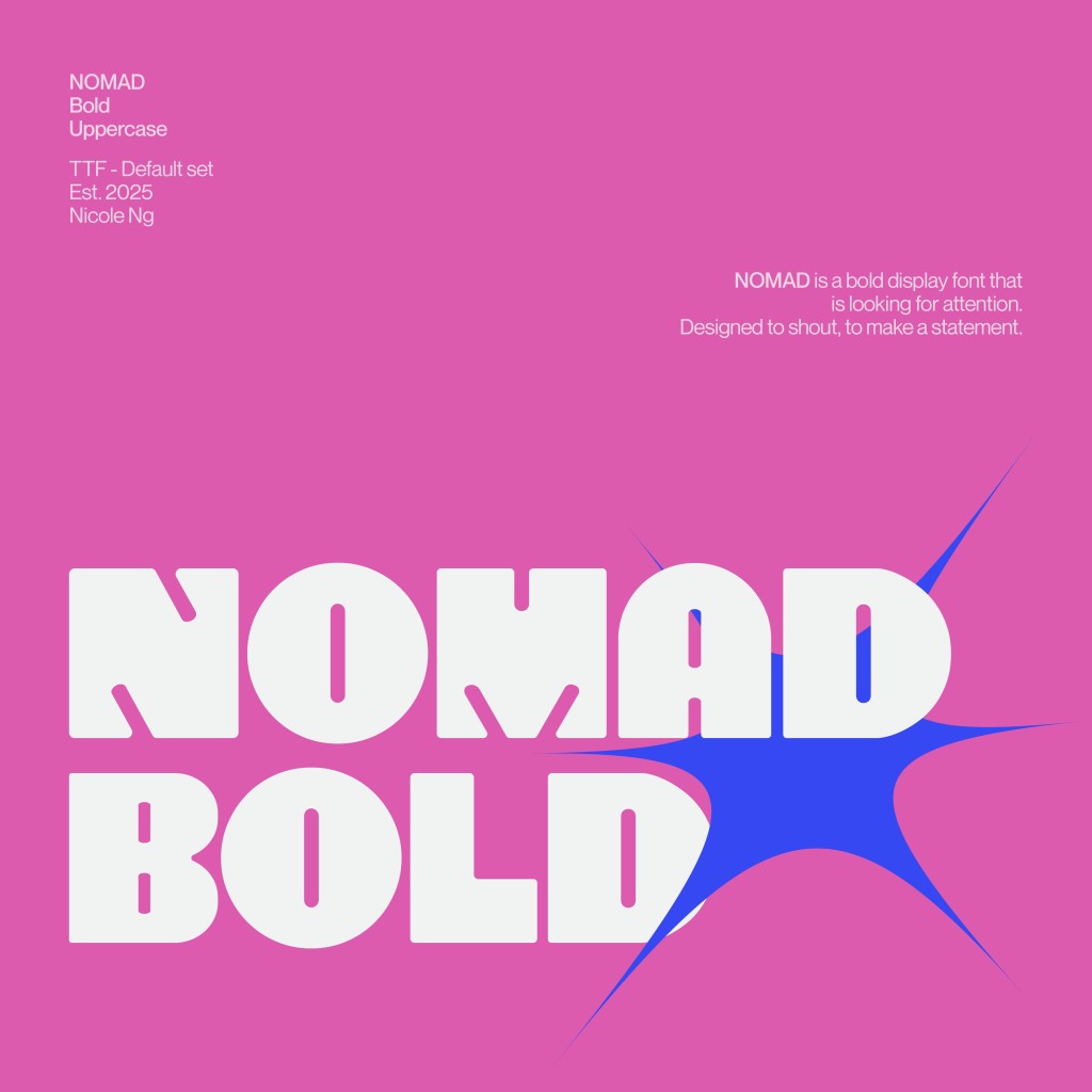 NOMAD is a font designed for the final project of my Advanced Typography module, expanded from the wordmark I designed for a previous task. It is also one of my proudest achievements in my design journey.